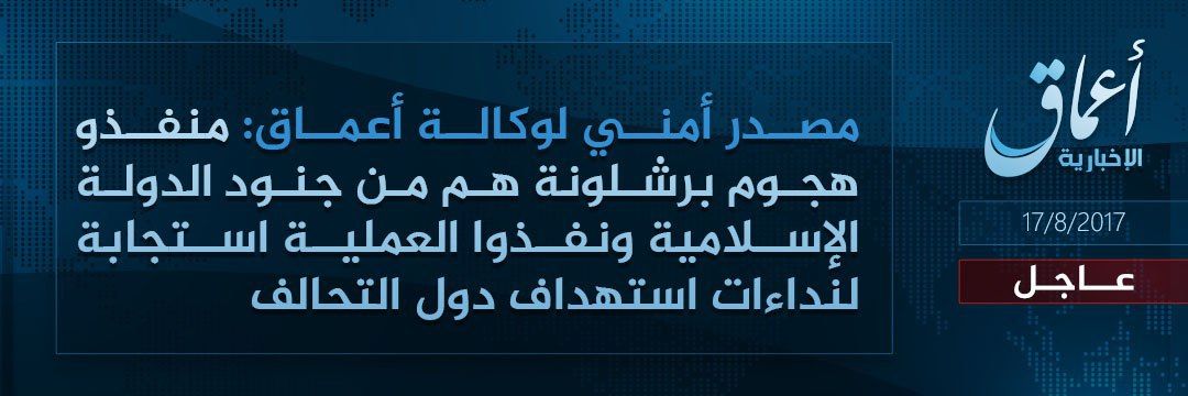 一方、イスラム国系メディアの「アマク通信」は2017年8月17日付の速報バナー画像で、ISとしての「事実上の犯行声明」を伝えた。「アマーク通信のセキュリティ筋によると、バルセロナにおける攻撃の実行者たちはイスラム国の戦士たちであり、(対IS)有志連合の国々を標的にせよという呼びかけに応じて作戦を実施した」と簡潔に伝えている。