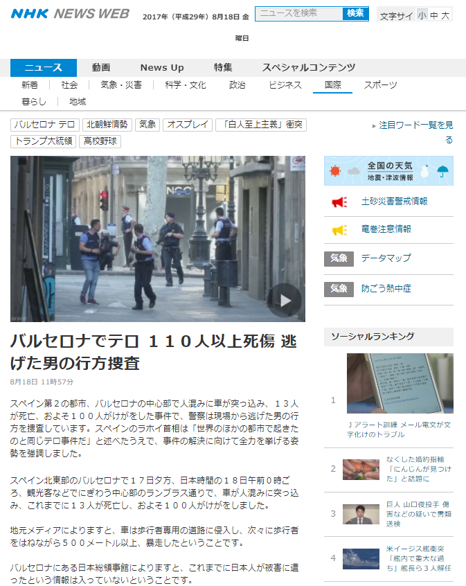 NHKによると、スペインのバルセロナで日本時間の18日未明、観光客でにぎわう中心部の通りに車が突っ込み、13人が死亡、およそ100人がけがをした。警察はテロ事件と断定して、現場から逃げた男の行方を捜査中と報じている。