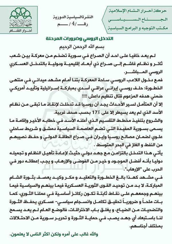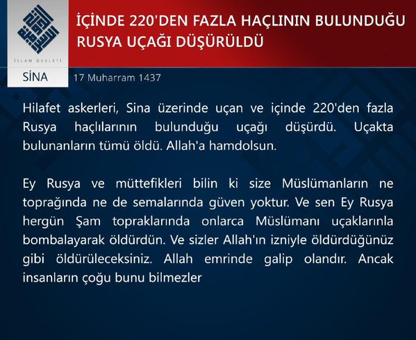 イスラム国の公認通信社「アウマーク通信」は2015年10月31日付配信記事において、エジプトのシャルム・エル・シェイクを離陸したロシアの旅客機がシナイ半島上空で、イスラム国の戦闘員たちによって撃墜されたと報じている。アウマーク通信によれば、ロシアがシリアで行っている空爆作戦によって多数のイスラム教徒が死亡していることに対する報復だとしている。
