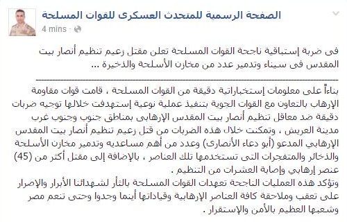 上の画像は、エジプト軍報道官のフェイスブック公式ページにおける関連の投稿である。