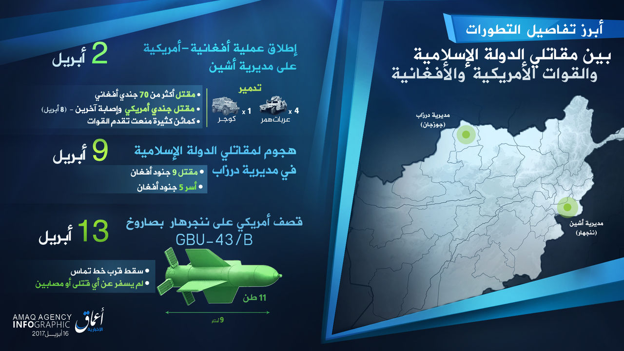 「昨日(13日)のナンガハルでのGBUー43/B型ミサイルによるアメリカの空爆について、関係筋はアマーク通信に対し、死傷者の発生を否定した」※参考:AFP通信によると、 アメリカ軍は13日、アフガニスタン東部のナンガルハル州でイスラム国の地下トンネル施設を標的として、「GBU-43/B・大規模爆風爆弾」による空爆を実施したと発表した。この爆弾は、核兵器以外の通常兵器では最大の破壊力があり、「すべての爆弾の母」と呼ばれているという。