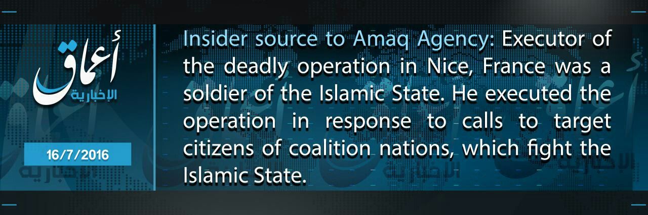 ・イスラム国系メディアのアマーク通信は、2016年7月16日付配信の速報バナーで、「アマーク通信のセキュリティ取材源:フランスのニースにおける(※トラックを使った)ひき殺し作戦の実行者は、イスラム国の戦士の一人である。イスラム国と戦う(有志)連合の国々の市民を標的にせよという呼びかけに応じて行われた」と報じた(※はブログ管理人による補足、和訳はアラビア語版に基づく)。