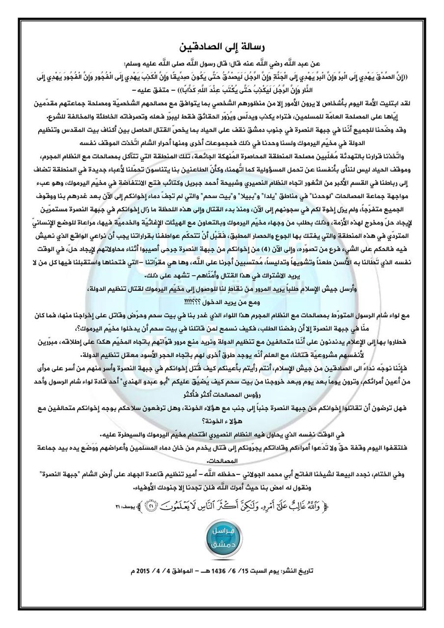 なお、アラビア語紙の報道では、最近シリア解放機構から主要な反政府組織の分離や著名な幹部の離脱が相次ぐ中、組織の引き締めを図るために、すでに事実上の指導者であったジュラニが名実ともにトップに就任したと報じている。