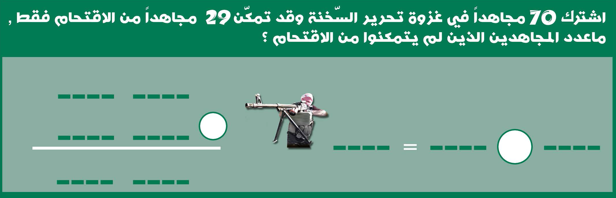 「70人のジハード戦士がスクナ(※シリア中部の都市)解放作戦に参加しました。進攻できたジハード戦士は29人だけでした。進攻できなかったジハード戦士は何人でしょう?」
